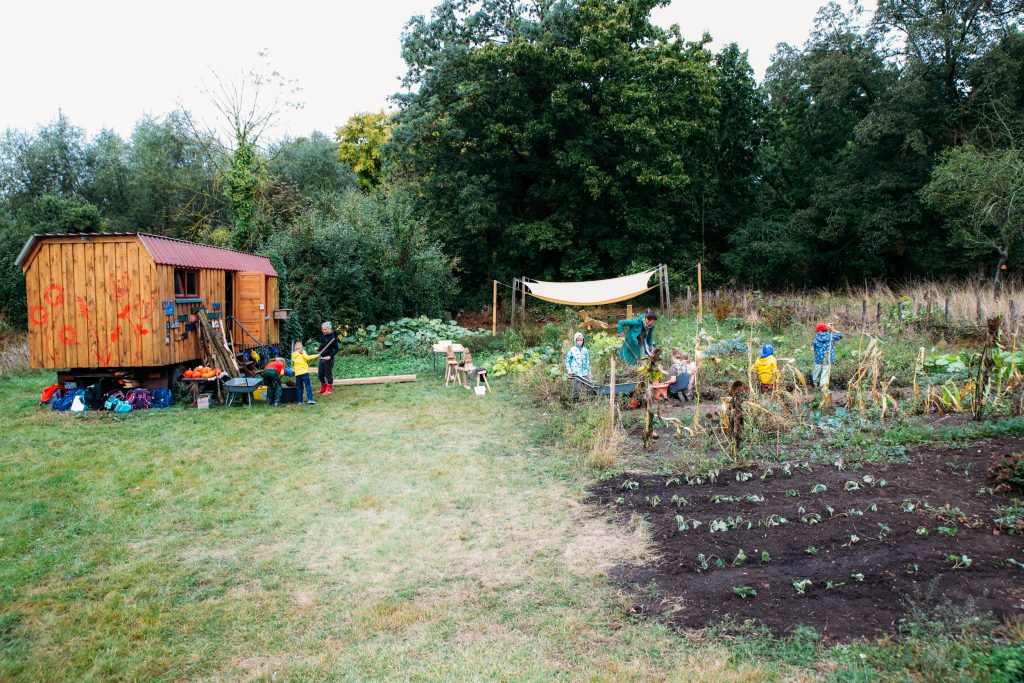 Auf dem Nachbargrundstück befindet sich unser Schulgarten; oft spielen die Kinder im Park Schweta auf dem Fußballfeld, Spielplatz oder im Verkehrsgarten.