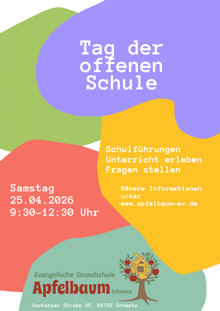 Wir laden ein zum „Tag der offenen Schule“ am Samstag, dem 25. April 2026. Zwischen 9:30 und 12:30 Uhr freuen wir uns über Kinder, Eltern und andere Interessierte, denen wir unsere Schule und unser besonderes Konzept vorstellen dürfen. Die Kinder der Apfelbaumschule werden an diesem Tag Unterricht haben und alle Besucher haben die Möglichkeit ihnen über die Schulter zu schauen oder einfach mitzumachen.