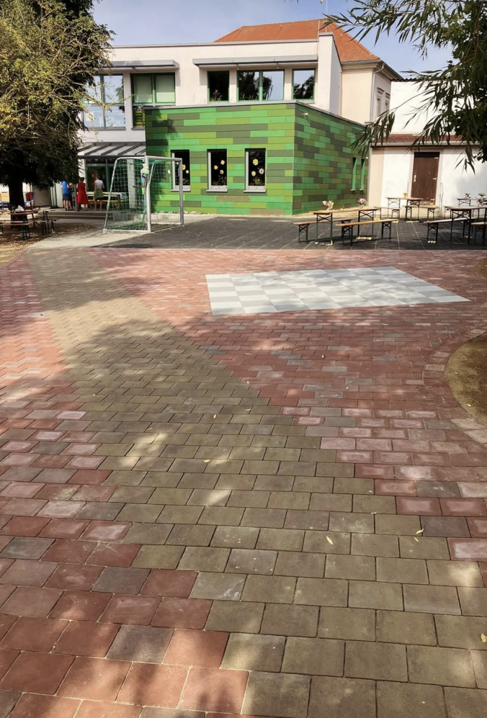 Eine ca. 200 Quadratmeter große Fläche des Schulhofes, welche zugleich Zugangsbereich und Verbindungsweg für Rollstuhlfahrer ist, wurde mit versickerungsfähigem, kinderfreundlich farbigen Ökopflaster befestigt. In diese Fläche wurden ein Großschachfeld und eine „Fahrbahn“ für Spielfahrzeuge durch farbige Pflastersteine integriert.